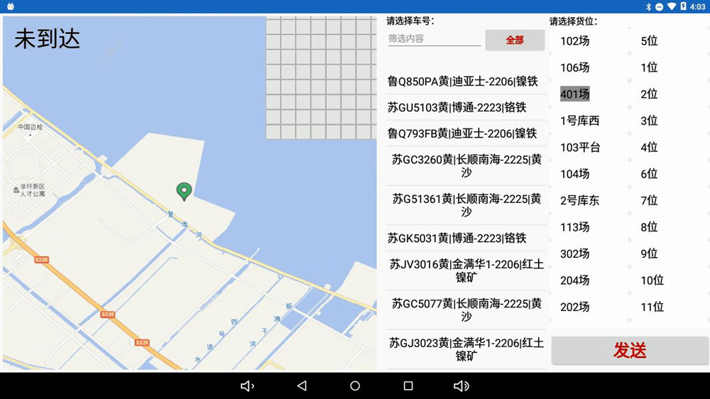 2、根据GPS获取斗车垛位,司机确认作业 根据GPS定位信息获取当前斗车所在的垛位信息,车载终端显示对应的已申报该货位任务且已完成空车过磅的车辆信息,斗车根据现场实际车辆情况选择作业车号进行装车确认,如没有自动获取到当前现场待装车辆信息,则可能是车辆申报任务错误或者车辆到达垛位错误,无法继续完成装车作业,有效避免现场漏装、错装情况的发生,特殊异常情况机械司机可直接向中控调度反馈协调处理。具体操作界面如左图所示。