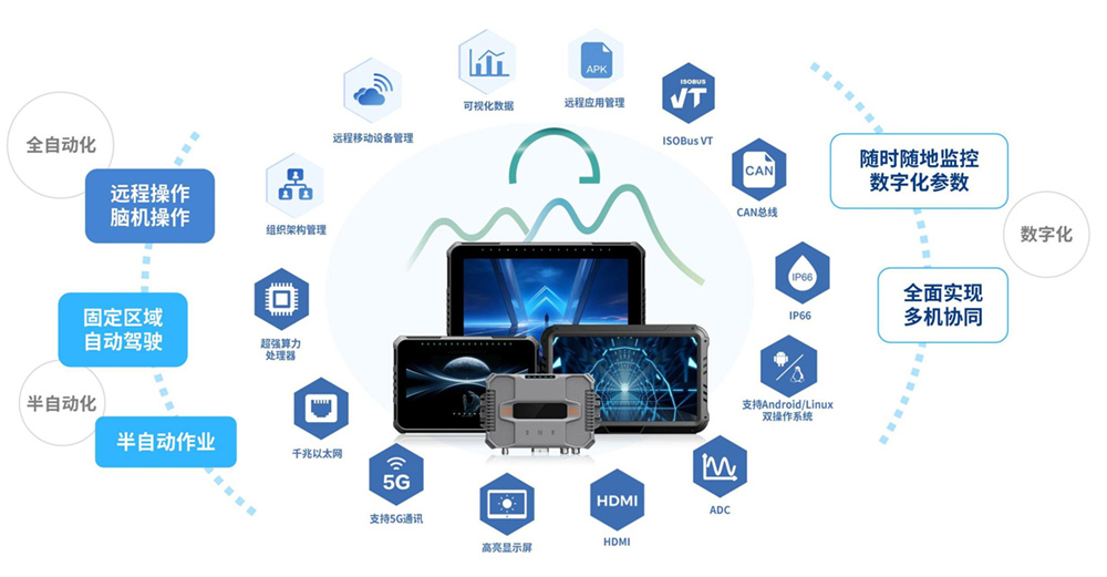 从飞智能坚固型工业车载平板系列,行业首创防眩晕全面屏、配备超强算力处理器、支持ISOBUSVT、支持厘米级高精度定位、具备优秀CAN总线能力、轻松完成软件开发,性能强劲,为您量身打造。通过将它安装在车里,可以将车内空间变成你的移动工作站,随时进行各种操作和处理任务。帮助你在恶劣的环境下正常工作,为您的工作带来更好的效率和生产力。适用于各种不同的行业,如精准农业、智慧交通、自动化施工、矿山机械、智慧医疗、空港码头和智慧仓储等。