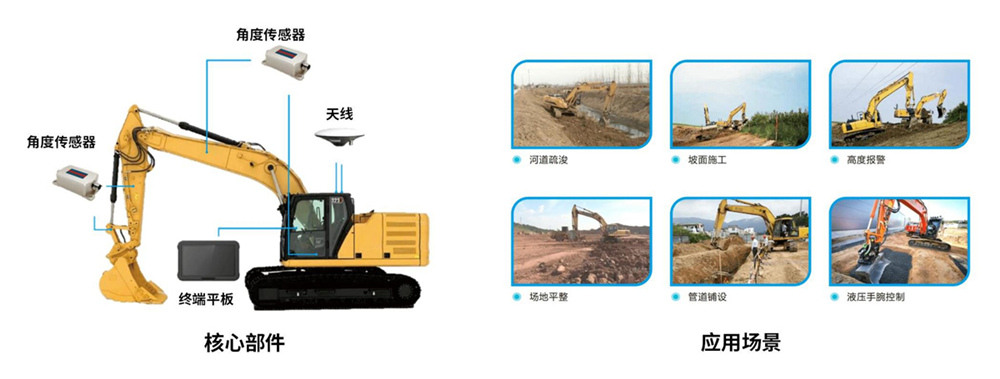 安装在挖掘机驾驶室上的定位天线、挖掘机三个机臂上的倾角传感器通过通信线束与平板连接,将数据实时传送进平板,平板里的软件利用这些数据通过算法实时算出挖掘机的挖尖距离目标坡面的实时垂直距离(刷坡辅助)、挖尖距离目标挖深底部的实时垂直距离(挖深辅助),最终以动画、语音、提示灯的形式展示在平板的屏幕上,提供施工参考。